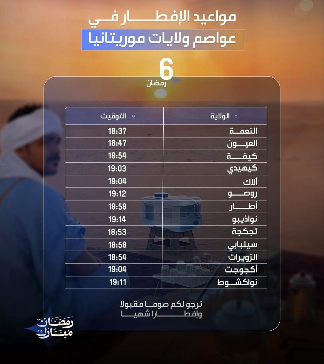 تتراوح أوقات الإفطار اليوم الثلاثاء سادس أيام شهر رمضان المبارك 1447 هجرية، في عواصم الولايات الموريتانية ما بين 18:37 دقيقة في مدينة النعمة عاصمة ولاية الحوض الشرقي، و19:14 دقيقة في مدينة نواذيبو عاصمة البلاد الاقتصادي