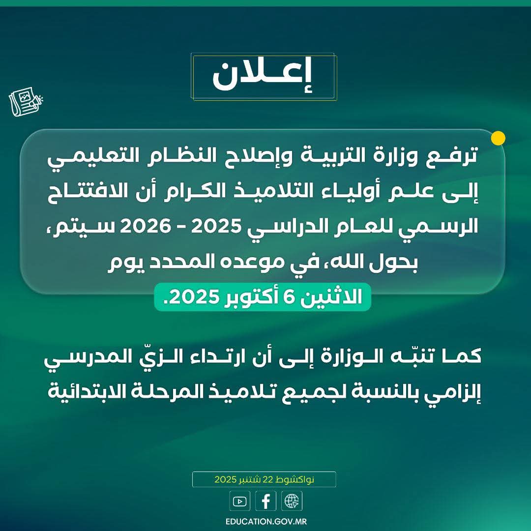 كما أكدت الوزارة في إعلان موجه إلى أولياء التلاميذ أن ارتداء الزي المدرسي إلزامي بالنسبة لجميع تلاميذ المرحلة الابتدائية.