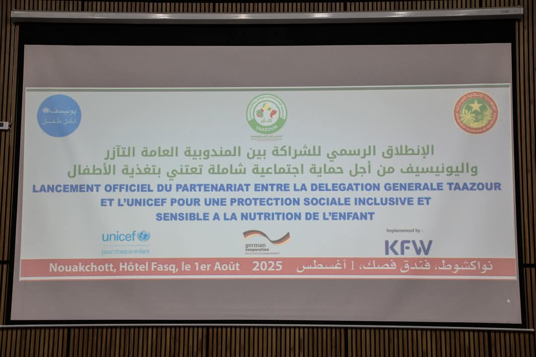 أعلنت المندوبية العامة للتضامن الوطني ومكافحة الإقصاء “التآزر”، اليوم الجمعة 1 أغسطس 2025، في نواكشوط، عن الانطلاقة الرسمية لشراكة استراتيجية مع صندوق الأمم المتحدة للطفولة “اليونيسف”، تهدف إلى تعزيز الحماية الاجتماعية للفئات الهشة، مع تركيز خاص على تغذية الأطفال، وذلك في إطار الرؤية الوطنية من أجل حماية اجتماعية شاملة.