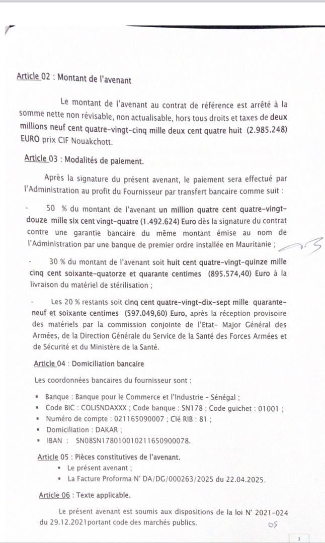 وكان وزير الثقافة والفنون والاتصال والعلاقات مع البرلمان، الناطق باسم الحكومة، الحسين ولد مدو، قد قال إن الحديث عن وجود فساد في صفقة الجيش الوطني ووزارة الصحة “لا أساس له من الصحة”، موضحا أن مصدر هذه الادعاءات هو جهات خسرت الصفقة بعد إخلالها بالتزاماتها التعاقدية مع وزارة الصحة.