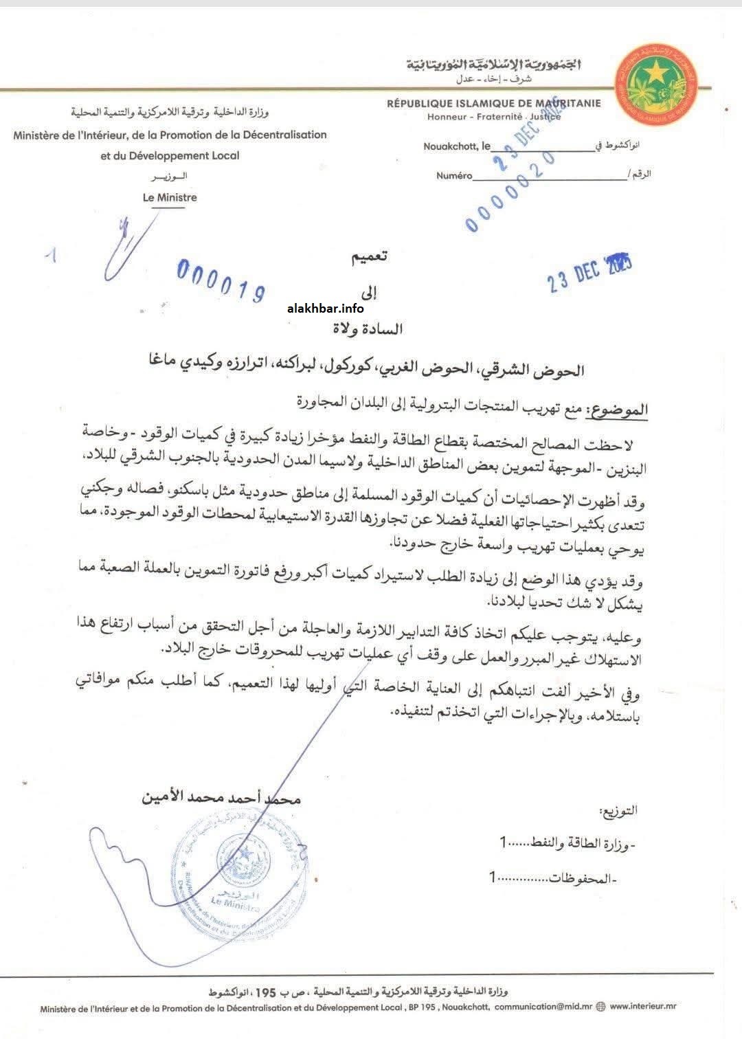 أمر وزير الداخلية وترقية اللا مركزية والتنمية المحلية محمد أحمد ولد محمد الأمين ولاة الولايات الجنوبية والشرقية من البلاد باتخاذ الإجراءات الكفيلة بوقف أيّ تهريب للوقود إلى البلدان المجاورة.