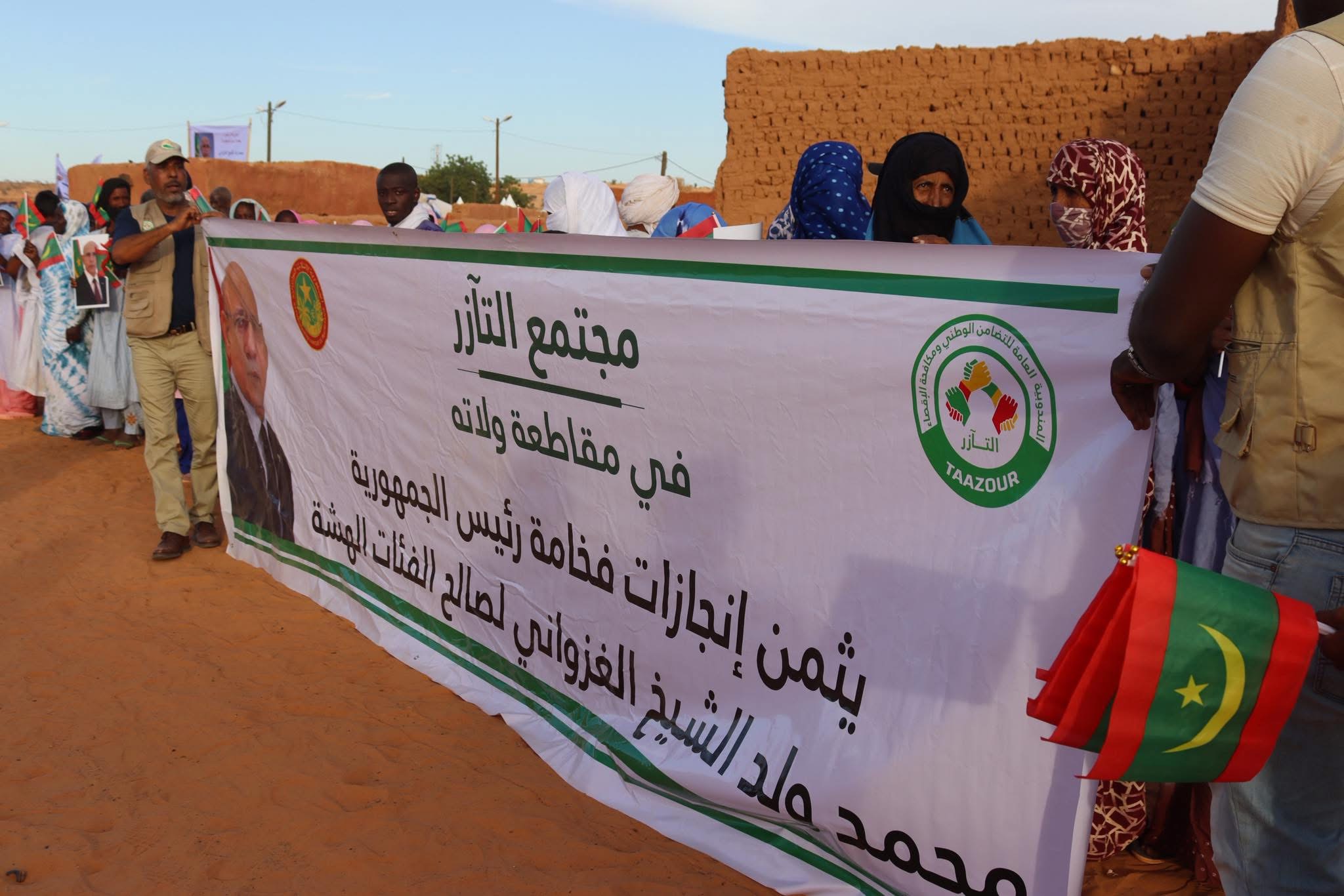 استقبل مجتمع “التآزر” في مدينة ولاتة، مساء اليوم الجمعة 7 نوفمبر 2025، فخامة رئيس الجمهورية السيد محمد ولد الشيخ الغزواني، وسط استقبال شعبي واسع يعكس تقدير المواطنين للجهود الوطنية الرامية إلى تحسين ظروف الفئات الهشة وتعزيز التضامن الاجتماعي. وأكد المشاركون دعمهم للمشروعات التنموية التي تنفذها المندوبية العامة للتضامن الوطني ومكافحة الإقصاء “التآزر”، والتي تعكس التوجيهات السامية لفخامته الهادفة إلى تقريب الخدمات الأساسية من المواطنين وتسهيل حياتهم في مختلف مناطق الوطن.