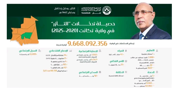 وبحسب المعطيات المنشورة، بلغ إجمالي الاستثمارات التي ضختها المندوبية في الولاية نحو 9.668.092.356 أوقية قديمة، توزعت على عدة قطاعات أساسية شملت التعليم والمياه والصحة والسكن الاجتماعي والأمن الغذائي والاندماج الاقتصادي.