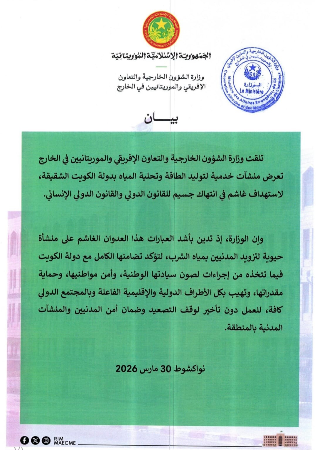 أدانت وزارة الخارجية والتعاون الإفريقي والموريتانيين في الخارج استهداف منشآت خدمية لتوليد الطاقة وتحلية المياه بدولة الكويت.