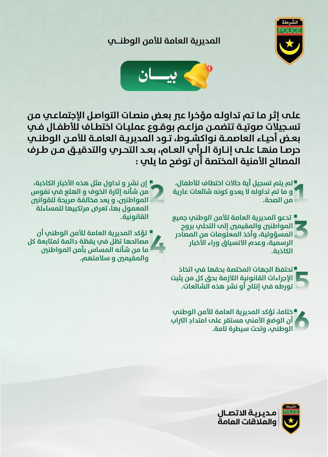 نفت المديرية العامة للأمن الوطني، مساء اليوم، صحة ما تم تداوله على منصات التواصل الاجتماعي بشأن وقوع حالات اختطاف للأطفال في بعض أحياء نواكشوط، مؤكدة أن هذه المزاعم "لا أساس لها من الصحة".