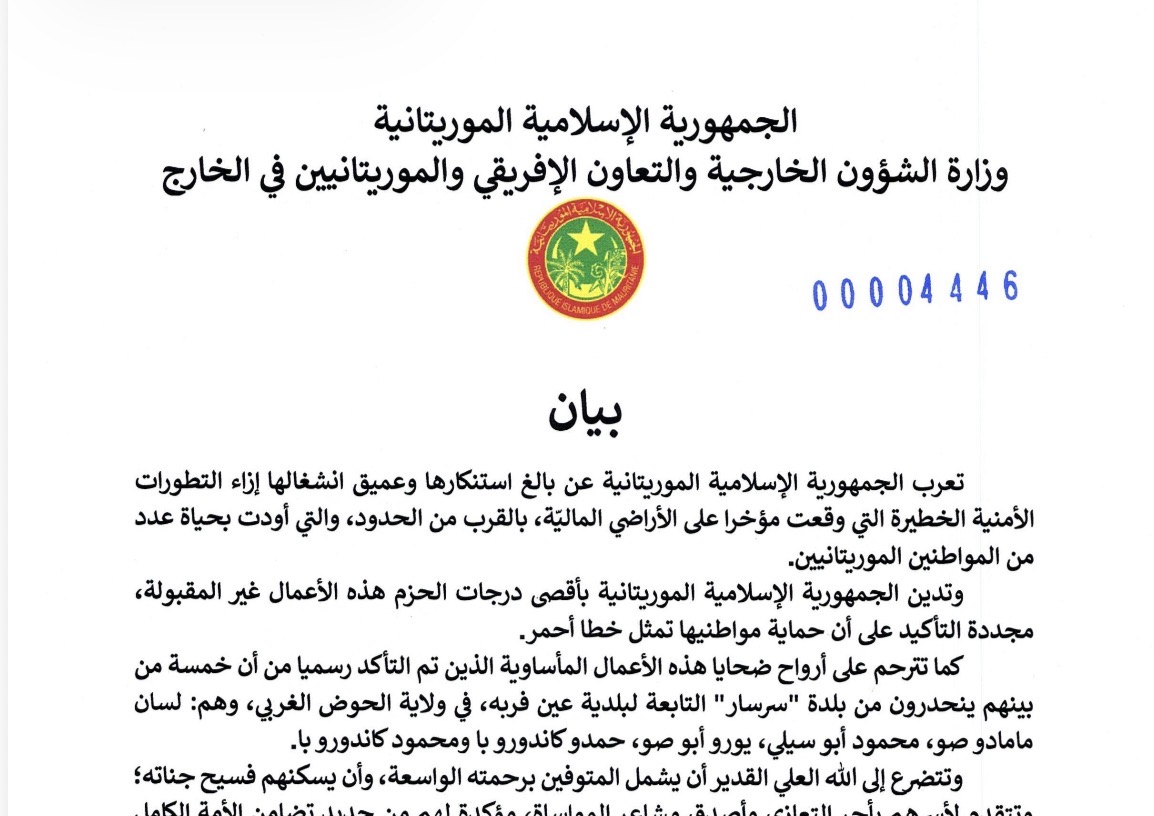 قتل خلال الساعات الماضية عدة موريتانيين ينحدرون من قرية "سرسار" التابعة لبلدية عين فربه في ولاية الحوض الغربي، وذلك في منطقة تبعد نحو 70 كلم داخل الأراضي المالية.