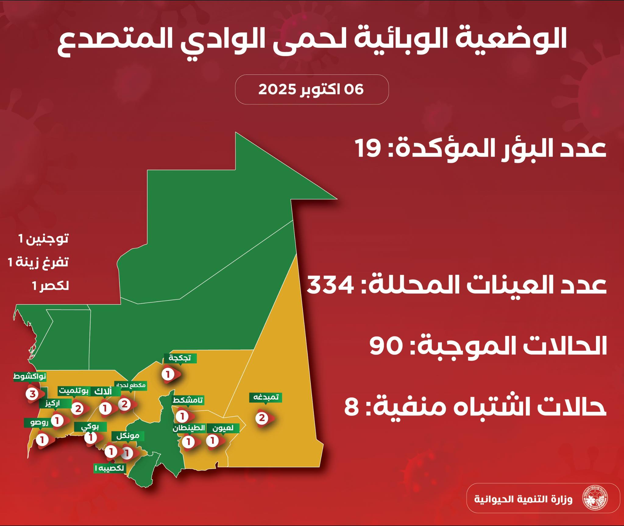 أعلنت السلطات الموريتانية اليوم الثلاثاء تسجيل 19 بؤرة من حمى الوادي المتصدع في 16 مقاطعة، منذ رصد أول إصابة قبل أسابيع.