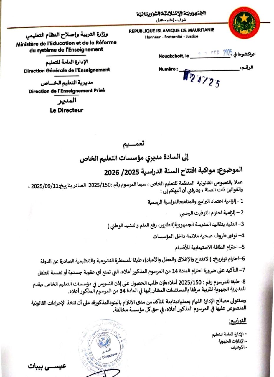 ألزمت وزارة التربية وإصلاح النظام التعليمي مؤسسات التعليم الخاصة باعتماد البرامج والمناهج الدراسية، وبالتقيد بتقاليد المدرسة الجمهورية.