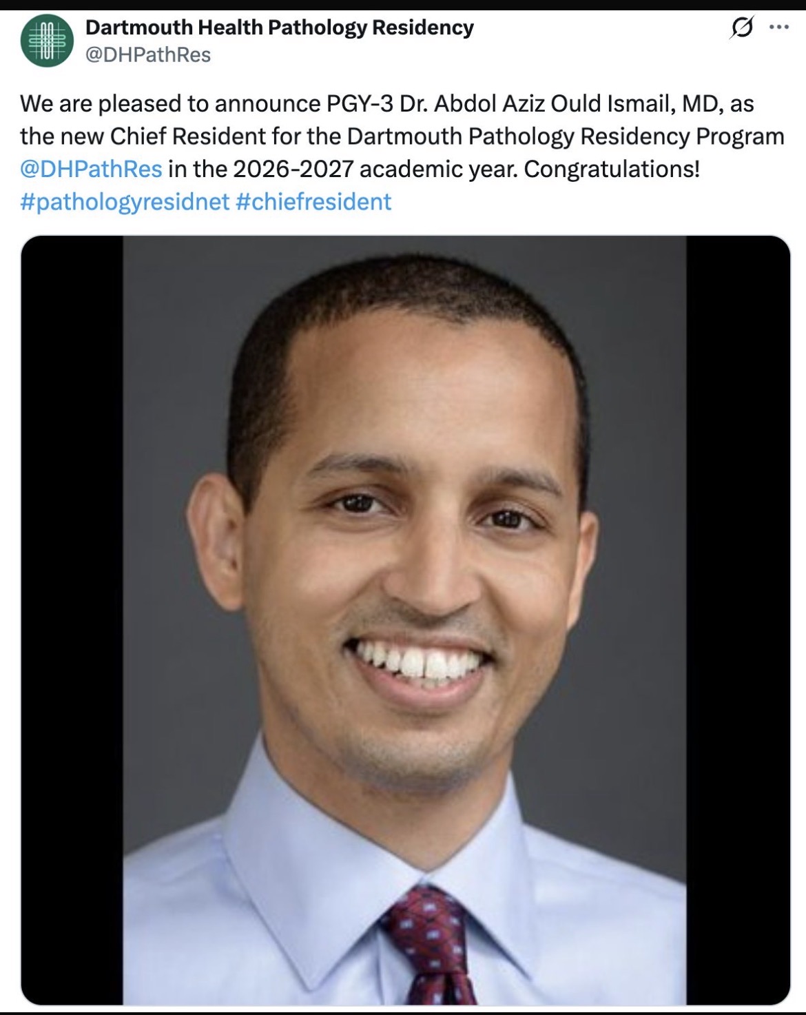 أعلن برنامج الإقامة في علم الأمراض التابع لـ Dartmouth Health، في الولايات المتحدة الأمريكية، عن تعيين الدكتور عبد العزيز ولد إسماعيل ولد الرباني، المقيم في السنة الثالثة (PGY-3)، رئيسًا للأطباء المقيمين (Chief Resident) لبرنامج الإقامة في علم الأمراض للعام الأكاديمي 2026–2027، مع تقديم التهاني له على هذا الإنجاز.
